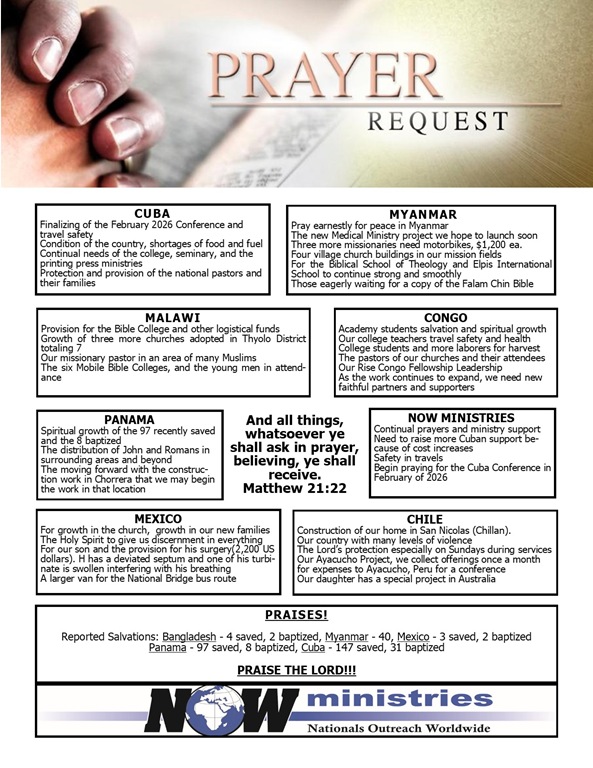 Category: Prayer List Tags: baptised, Chile, Congo, Cuba, Malawi, Mexico, Myanmar, NOW Ministries, Panama, Praises, prayer request